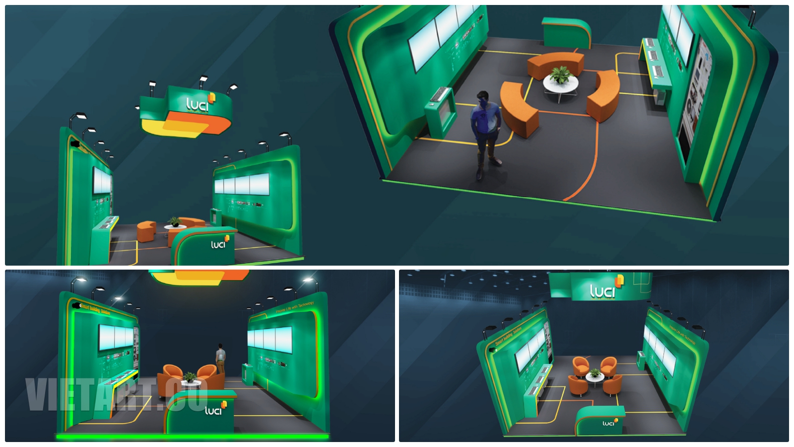 . Với giải pháp cho Gian hàng công nghệ, VietArt đã thiết kế và thi công phù hợp với các chức năng của LUCI, với không gian trống 6x6m , VietArt đã thiết kế và thi công Booth theo phong cách mở , tạo nên sự tương tác trở nên thoải mái và dẽ chịu hơn đi cùng với không gian mở kết hợp với màu xanh lá làm chủ đạo đã làm nên cho gian hàng thêm nổi bật và cuốn hút. Booth Luci cũng đã được ban tổ chức chứng nhận " Gian hàng quy mô - thiết kế đẹp & ấn tượng"